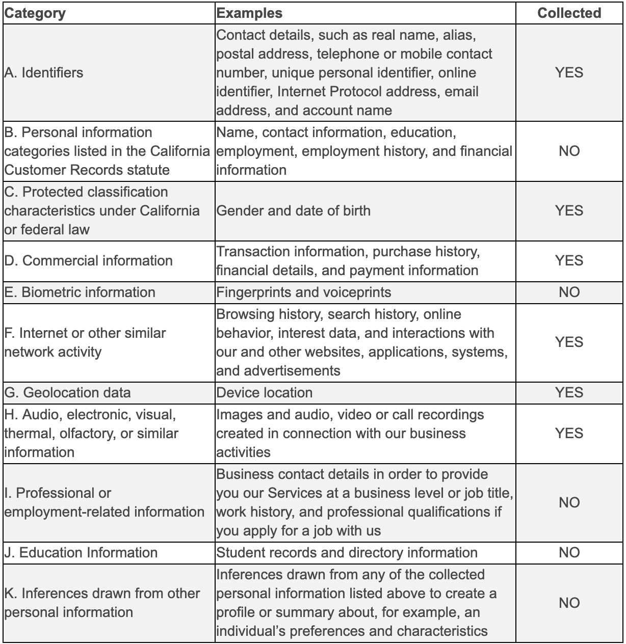 What categories of personal information do we collect?We have collected the following categories of personal information in the past twelve (12) months: